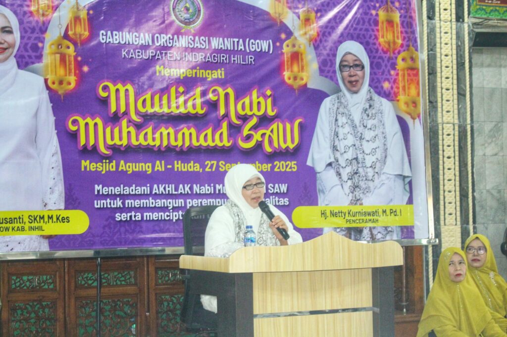 Peringatan Maulid Nabi Muhammad SAW 1447 H tajaan GOW Inhil, dilengkapi tausiah agama oleh Ustadzah Netty Kurniawati yang menyampaikan tentang ajaran Baginda Rasul dalam beribadah dan kehidupan sosial.