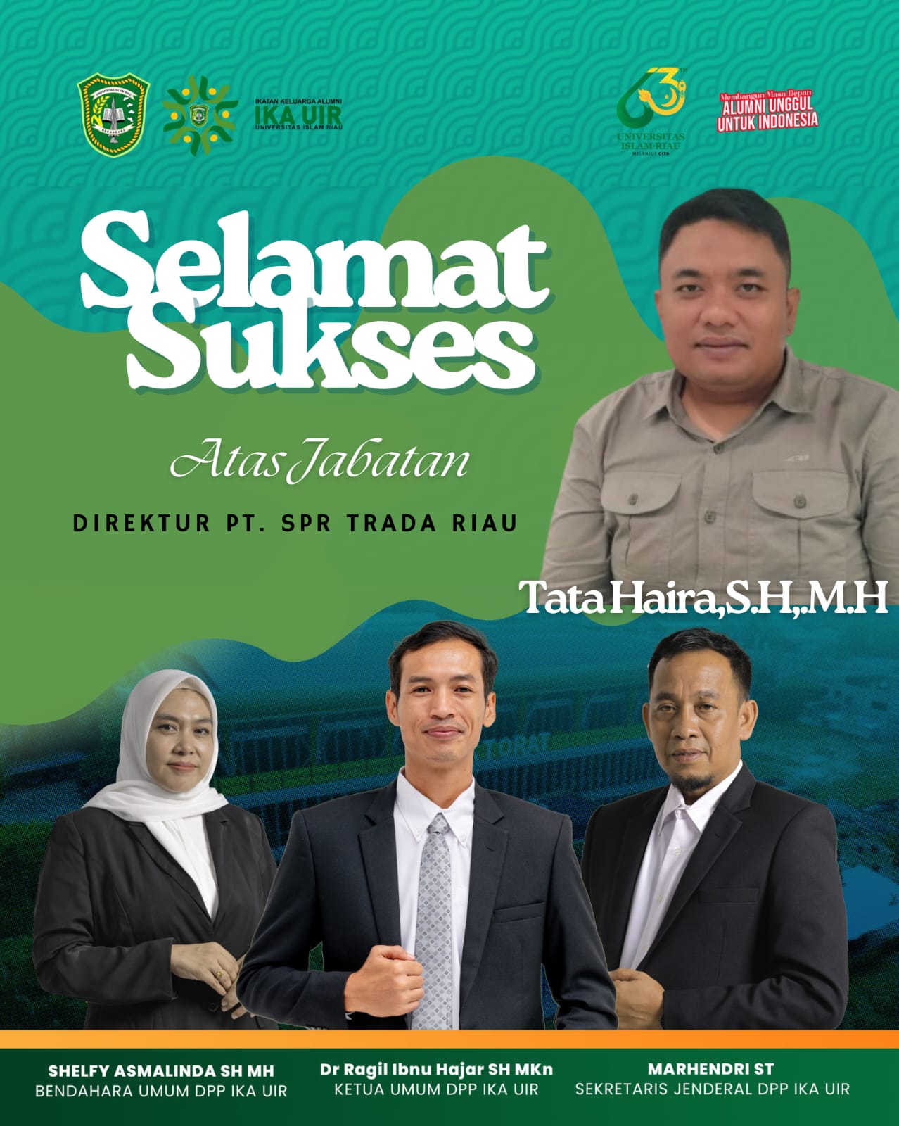 DPP IKA UIR juga menyampaikan ucapan selamat kepada Tata Haira, S.H., M.H. yang baru saja dipercaya sebagai Direktur PT SPR Trada Riau. Penunjukan tersebut menjadi bukti nyata bahwa generasi muda alumni UIR mampu menempati posisi strategis dan membawa perubahan positif di lingkungan BUMD Riau.