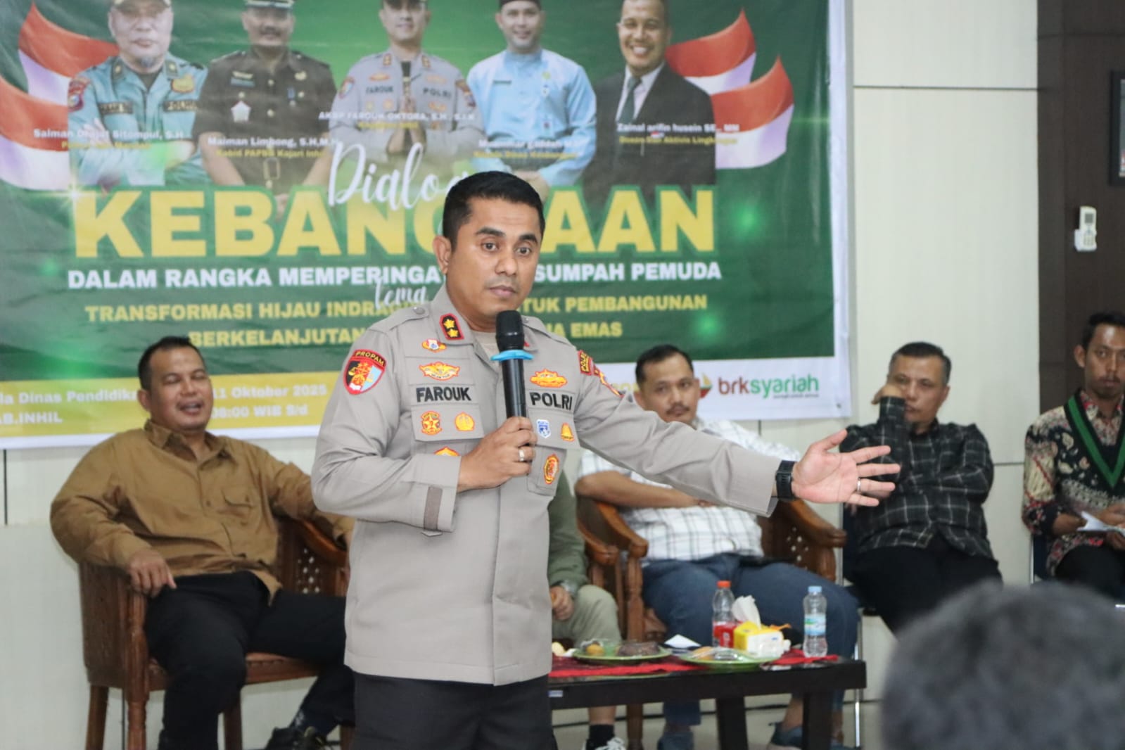 Sementara itu, Kapolres Indragiri Hilir AKBP Farouk Oktora menyampaikan materi mengenai Green Policing dan peran pemuda dalam menjaga nilai-nilai kebangsaan. Ia menekankan bahwa alam adalah titipan bagi generasi mendatang, sehingga masyarakat perlu mengubah pola pikir dalam menjaga kelestarian lingkungan.