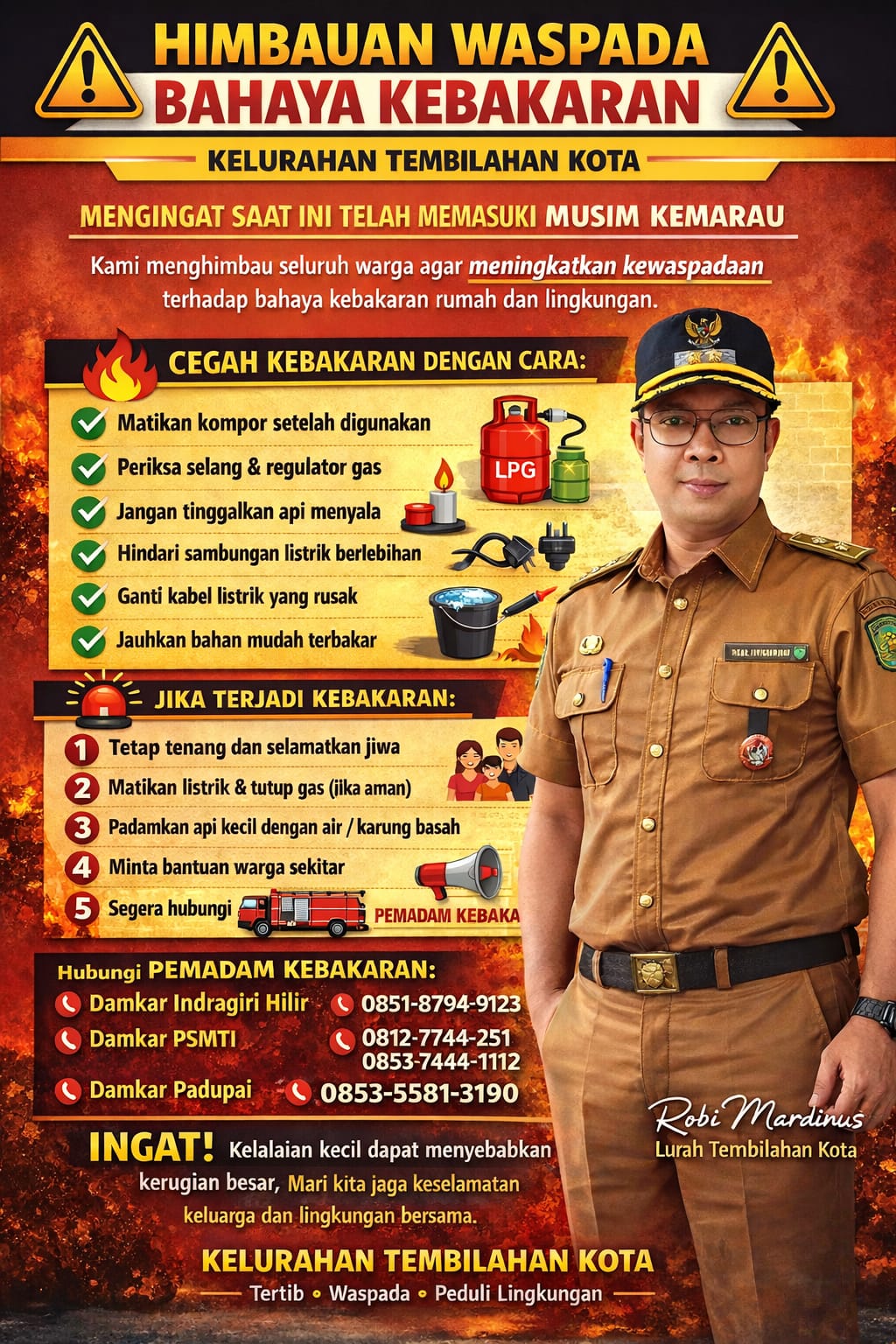 Imbauan ini ditujukan kepada seluruh masyarakat Kelurahan Tembilahan Kota, baik di kawasan padat penduduk maupun perumahan, agar lebih berhati-hati dalam aktivitas sehari-hari yang berpotensi memicu terjadinya kebakaran.